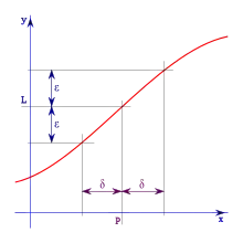 - plus rigoureusement, pour tout « écart de tolérance » ε > 0, on peut trouver un « écart de confiance » δ > 0 tel que, dès que x (appartenant à Df) est proche de p à δ près, f(x) est proche de L à ε près :