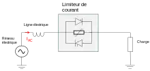 Un limiteur de courant de défaut à semiconducteurs peut être schématisé par deux éléments semiconducteurs montés en tête-bêche. Naturellement chacun de ces éléments est lui-même constitué de nombreux semiconducteurs montés en série : plus la tension est élevée plus leur nombre est grand. Si les semiconducteurs utilisés sont des thyristors, en cas de court-circuit, le système commence par limiter le courant, mais ne peut l'interrompre qu'au premier zéro du courant. Si des GTO, IGCT ou IGBT sont employés, l'interruption peut être instantanée : de l'ordre de 100 us[20]. Au moment de l'interruption, le système insère une résistance dans le circuit pour absorber l'énergie. Ils sont très rapides et permettent de limiter non seulement les défauts, mais également les courants d'enclenchement et les chocs de manœuvre. Le coût important doit donc être mis en relation avec le gain en durée de vie procuré aux transformateurs ainsi protégés[21].