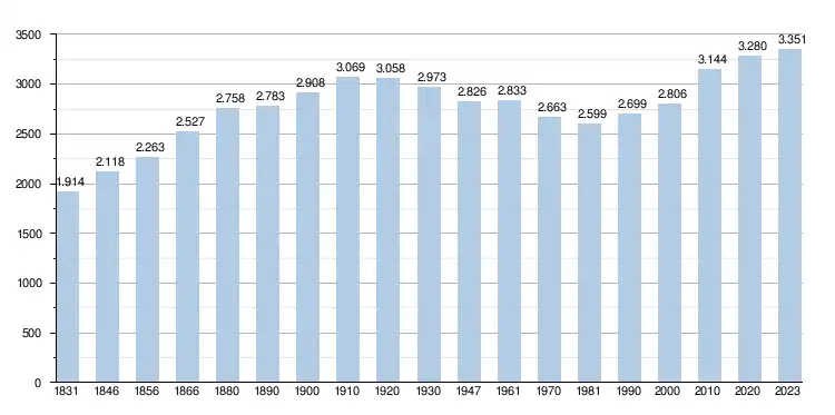 Les chiffres des années 1831 à 1970 tiennent compte des chiffres des anciennes communes fusionnées.