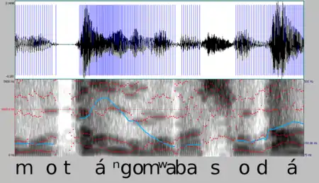| a | A | á â ǎ | /a/ | nyama (animal), matáta (difficulté), sâmbóle (énigme), libwǎ (neuf), awa (ici) |