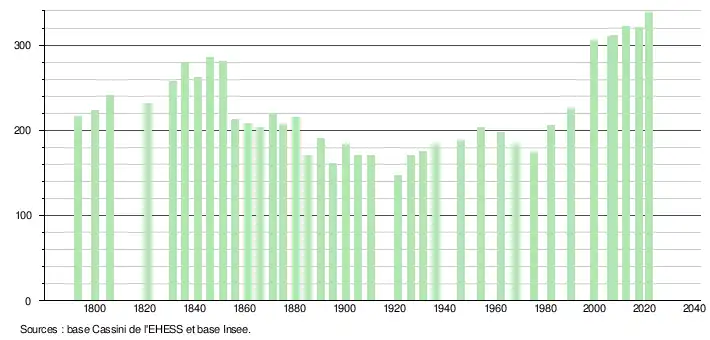 L'évolution du nombre d'habitants est connue à travers les recensements de la population effectués dans la commune depuis 1793. Pour les communes de moins de 10 000 habitants, une enquête de recensement portant sur toute la population est réalisée tous les cinq ans, les populations légales des années intermédiaires étant quant à elles estimées par interpolation ou extrapolation[16]. Pour la commune, le premier recensement exhaustif entrant dans le cadre du nouveau dispositif a été réalisé en 2007[17].