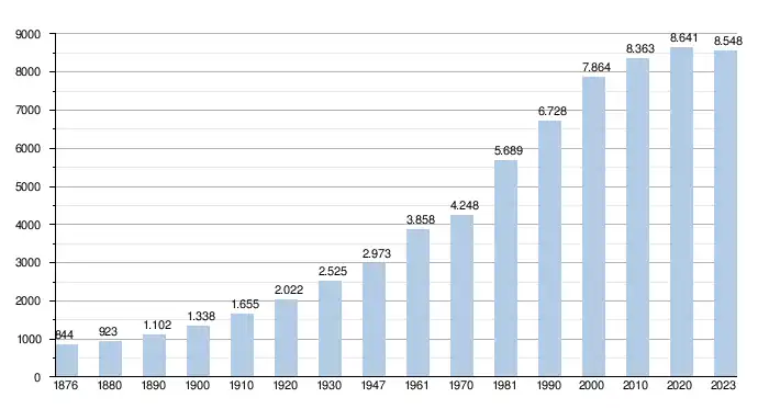 - Source : DGS - Remarque: 1876 jusqu'à 1981=recensement; depuis 1990=nombre d'habitants chaque 1er janvier[5]