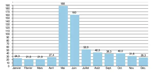 En ce qui concerne la période estivale, libre de glaces (de juin à octobre inclus), le débit mensuel minimal observé a été de 15,1 m3/s en .