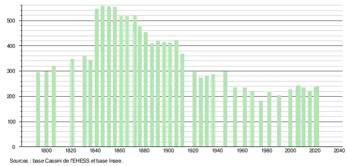 L'évolution du nombre d'habitants est connue à travers les recensements de la population effectués dans la commune depuis 1793. Pour les communes de moins de 10 000 habitants, une enquête de recensement portant sur toute la population est réalisée tous les cinq ans, les populations légales des années intermédiaires étant quant à elles estimées par interpolation ou extrapolation[28]. Pour la commune, le premier recensement exhaustif entrant dans le cadre du nouveau dispositif a été réalisé en 2005[29].