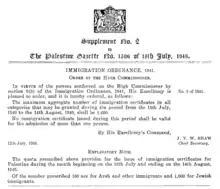 Le , les autorités annoncent la suspension de toute immigration juive en Palestine jusqu'en . La raison invoquée est l'augmentation du nombre d'immigrants illégaux[7].