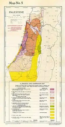 « Dans la zone A, qui représente environ 63 % du pays, y compris les collines rocheuses, les transferts de terres, sauf à un Arabe palestinien, sont en général interdits. Dans la zone B, qui représente environ 32 % du pays, les transferts de terres d'un Arabe palestinien à un autre Arabe palestinien étaient sévèrement limités à la discrétion du Haut Commissaire. Dans le reste de la Palestine, soit environ cinq pour cent du pays - qui comprend toutefois les zones les plus fertiles - les ventes de terres sont restées libres[32]. »