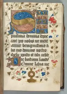 Un livre d'heures est un livre liturgique destiné aux fidèles catholiques laïcs — à la différence du bréviaire, destiné aux clercs — et permettant de suivre la liturgie des Heures. En complément de ce recueil de prières liées aux heures de la journée, le livre d'heures comprend généralement un calendrier pour suivre l'évolution de la liturgie tout au long de l'année, mais aussi parfois des psaumes, les évangiles ainsi que des offices particuliers. Il s'agit du type le plus courant d'ouvrage médiéval enluminé même si tous ne comportent pas de décorations. Ils constituent à ce titre une importante documentation sur la vie à la fin du Moyen Âge et sont la source d'une iconographie sur la chrétienté médiévale.