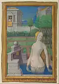 Bethsabée au bain | Getty Center, Los Angeles, Ms. 79, recto. | Ouvre les Psaumes pénitentiels. Bethsabée est peinte entièrement nue, à peine couverte en partie par l'eau transparente. Ses cheveux blonds enluminent la page et répondent au tapis doré de la fenêtre d'où David l'observe. Bethsabée n'a pas l'air surprise, et bien au contraire semble vérifier, par son regard en biais, l'effet qu'elle produit. Elle répond certainement aux canons de beauté de l'Europe du Nord au XVe siècle finissant[2]. |