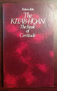 - Au premier rang des trésors inestimables rejetés par les vagues de l'océan tumultueux de la révélation de Bahá'u'lláh se place le Kitáb-i-Iqán (Livre de la Certitude), révélé en l'espace de deux jours et deux nuits, dans les dernières années de cette période (1278 Ap.H.- 1862 Ap.J-C.). Ce livre fut écrit pour accomplir la prophétie du Bāb qui avait spécifié que le Promis compléterait le thème inachevé du Bayán persan, et pour répondre aux questions posées à Bahá'u'lláh par Ḥájí Mírzá Siyyid Muḥammad, un oncle maternel du Báb - non converti encore -, lors d'une visite faite à Karbilá avec son frère, Ḥájí Mirzá Ḥasan ‘Alí. Modèle de prose persane au style tout à fait original, châtié, vigoureux et remarquablement clair, aux arguments convaincants, sans pareil par son irrésistible éloquence, ce livre, traçant les lignes générales du grand plan de rédemption de Dieu, occupe une position sans égale dans l'ensemble de la littérature baha'ie, à l'exception du Kitāb-i Aqdas, le très saint Livre de Bahá'u'lláh. Révélé à la veille de la déclaration de sa mission, il offrait à l'humanité le "vin cacheté de choix" fleurant le "musc", brisait les "sceaux" du "livre", cité par Daniel, et dévoilait le sens des "paroles" qui devait demeurer "caché" jusqu'au "temps de la fin"[2]