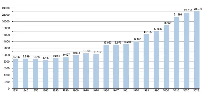 Elle comptait, au , 22 594 habitants (11 170 hommes et 11 424 femmes), soit une densité de 374,44 habitants/km²[5] pour une superficie de 60,34 km². Graphe de l'évolution de la population de la commune. Les données ci-après intègrent les anciennes communes dans les données avant la fusion en 1977.