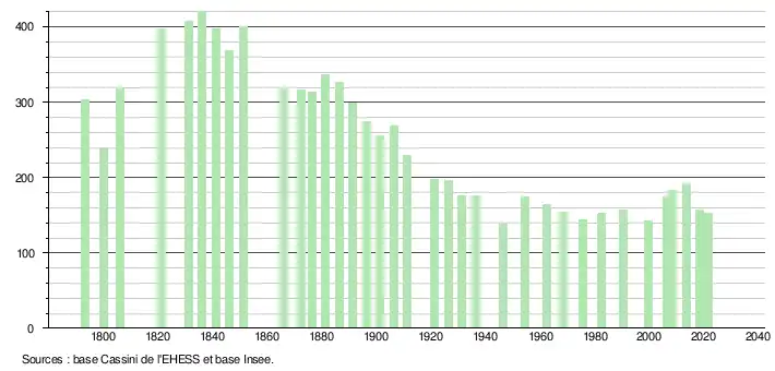 L'évolution du nombre d'habitants est connue à travers les recensements de la population effectués dans la commune depuis 1793. Pour les communes de moins de 10 000 habitants, une enquête de recensement portant sur toute la population est réalisée tous les cinq ans, les populations légales des années intermédiaires étant quant à elles estimées par interpolation ou extrapolation[19]. Pour la commune, le premier recensement exhaustif entrant dans le cadre du nouveau dispositif a été réalisé en 2008[20].