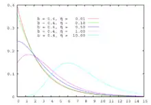 - η > 0,5 : la densité a son mode en où est la plus petite racine de .