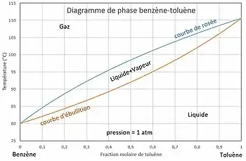 Ainsi, en imposant la température , la pression étant donnée, on peut calculer et , puis , , et . Si l'on choisit, arbitrairement, le corps comme référence, en faisant varier la température entre et , la courbe est la courbe d'ébullition, la courbe est la courbe de rosée.
