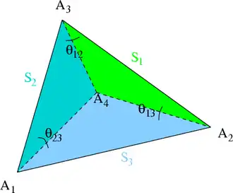 On considère un tétraèdre A1A2A3A4 de l'espace euclidien. La figure 10 ci-contre présente les notations concernant les sommets, faces et angles dans le tétraèdre :