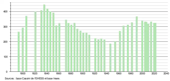 L'évolution du nombre d'habitants est connue à travers les recensements de la population effectués dans la commune depuis 1793. Pour les communes de moins de 10 000 habitants, une enquête de recensement portant sur toute la population est réalisée tous les cinq ans, les populations légales des années intermédiaires étant quant à elles estimées par interpolation ou extrapolation[16]. Pour la commune, le premier recensement exhaustif entrant dans le cadre du nouveau dispositif a été réalisé en 2004[17].