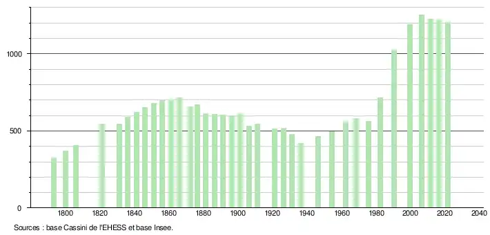 L'évolution du nombre d'habitants est connue à travers les recensements de la population effectués dans la commune depuis 1793. Pour les communes de moins de 10 000 habitants, une enquête de recensement portant sur toute la population est réalisée tous les cinq ans, les populations légales des années intermédiaires étant quant à elles estimées par interpolation ou extrapolation[26]. Pour la commune, le premier recensement exhaustif entrant dans le cadre du nouveau dispositif a été réalisé en 2006[27].