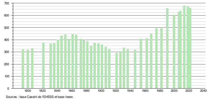 L'évolution du nombre d'habitants est connue à travers les recensements de la population effectués dans la commune depuis 1793. Pour les communes de moins de 10 000 habitants, une enquête de recensement portant sur toute la population est réalisée tous les cinq ans, les populations légales des années intermédiaires étant quant à elles estimées par interpolation ou extrapolation[18]. Pour la commune, le premier recensement exhaustif entrant dans le cadre du nouveau dispositif a été réalisé en 2008[19].