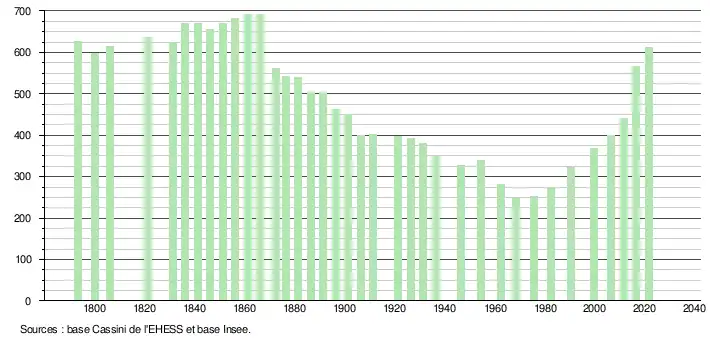 L'évolution du nombre d'habitants est connue à travers les recensements de la population effectués dans la commune depuis 1793. Pour les communes de moins de 10 000 habitants, une enquête de recensement portant sur toute la population est réalisée tous les cinq ans, les populations légales des années intermédiaires étant quant à elles estimées par interpolation ou extrapolation[18]. Pour la commune, le premier recensement exhaustif entrant dans le cadre du nouveau dispositif a été réalisé en 2006[19].