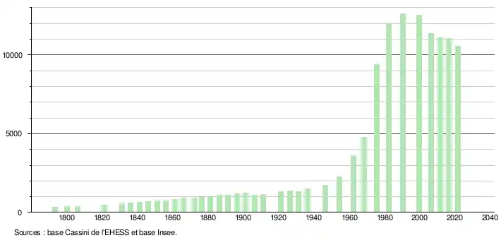 - Par convention dans Wikipédia, le principe a été retenu de n’afficher dans le tableau des recensements et le graphique, pour les populations légales postérieures à 1999, que les populations correspondant à une enquête exhaustive de recensement pour les communes de moins de 10 000 habitants, et que les populations des années 2006, 2011, 2016, etc. pour les communes de plus de 10 000 habitants, ainsi que la dernière population légale publiée par l’Insee pour l'ensemble des communes.
