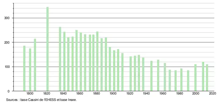 - Dans le tableau des recensements et le graphique, par convention dans Wikipédia, le principe a été retenu, pour les populations légales postérieures à 1999 de n’afficher dans le tableau des recensements et le graphique que les populations correspondant à l'année 2006, première population légale publiée calculée conformément aux concepts définis dans le décret no 2003-485 du 5 juin 2003, et les années correspondant à une enquête exhaustive de recensement pour les communes de moins de 10 000 habitants, ainsi que la dernière population légale publiée par l’Insee.