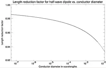 La longueur électrique d'un élément d'antenne dépend également du rapport longueur/diamètre du conducteur[19],[15],[20],[21]. Lorsque le rapport entre le diamètre et la longueur d'onde augmente, la capacité augmente, de sorte que le nœud se produit plus loin au-delà de l'extrémité, et la longueur électrique de l'élément augmente[19],[20]. Lorsque les éléments deviennent trop épais, la forme d'onde du courant devient significativement différente d'une onde sinusoïdale, de sorte que le concept entier de longueur électrique n'est plus applicable, et le comportement de l'antenne doit être calculé par des programmes informatiques de simulation électromagnétique (en) tels que NEC.