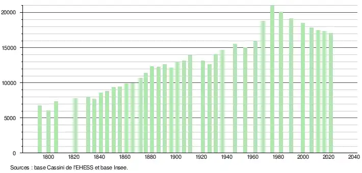 - Par convention dans Wikipédia, le principe a été retenu de n’afficher dans le tableau des recensements et le graphique, pour les populations légales postérieures à 1999, que les populations correspondant à une enquête exhaustive de recensement pour les communes de moins de 10 000 habitants, et que les populations des années 2006, 2011, 2016, etc. pour les communes de plus de 10 000 habitants, ainsi que la dernière population légale publiée par l’Insee pour l'ensemble des communes.