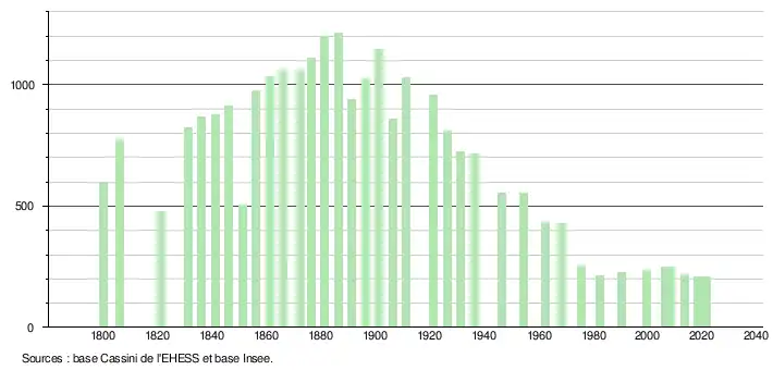 L'évolution du nombre d'habitants est connue à travers les recensements de la population effectués dans la commune depuis 1800. Pour les communes de moins de 10 000 habitants, une enquête de recensement portant sur toute la population est réalisée tous les cinq ans, les populations légales des années intermédiaires étant quant à elles estimées par interpolation ou extrapolation[8]. Pour la commune, le premier recensement exhaustif entrant dans le cadre du nouveau dispositif a été réalisé en 2008[9].
