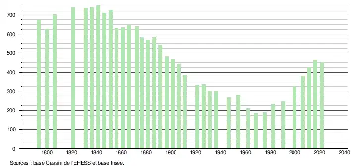L'évolution du nombre d'habitants est connue à travers les recensements de la population effectués dans la commune depuis 1793. Pour les communes de moins de 10 000 habitants, une enquête de recensement portant sur toute la population est réalisée tous les cinq ans, les populations légales des années intermédiaires étant quant à elles estimées par interpolation ou extrapolation[30]. Pour la commune, le premier recensement exhaustif entrant dans le cadre du nouveau dispositif a été réalisé en 2006[31].