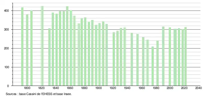 L'évolution du nombre d'habitants est connue à travers les recensements de la population effectués dans la commune depuis 1793. Pour les communes de moins de 10 000 habitants, une enquête de recensement portant sur toute la population est réalisée tous les cinq ans, les populations légales des années intermédiaires étant quant à elles estimées par interpolation ou extrapolation[22]. Pour la commune, le premier recensement exhaustif entrant dans le cadre du nouveau dispositif a été réalisé en 2007[23].