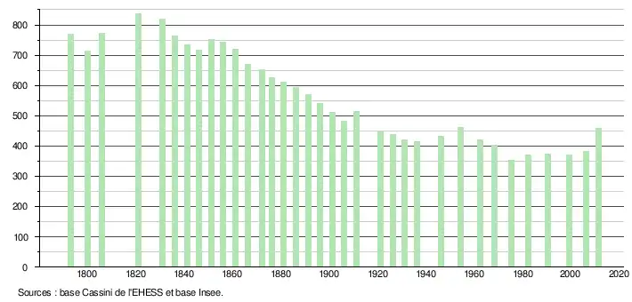 L'évolution du nombre d'habitants est connue à travers les recensements de la population effectués dans la commune depuis 1793. À partir du , les populations légales des communes sont publiées annuellement dans le cadre d'un recensement qui repose désormais sur une collecte d'information annuelle, concernant successivement tous les territoires communaux au cours d'une période de cinq ans. Pour les communes de moins de 10 000 habitants, une enquête de recensement portant sur toute la population est réalisée tous les cinq ans, les populations légales des années intermédiaires étant quant à elles estimées par interpolation ou extrapolation[10]. Pour la commune, le premier recensement exhaustif entrant dans le cadre du nouveau dispositif a été réalisé en 2006[11],[Note 1].