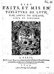 - Airs faits, et mis en tablature de luth, par Louis de Rigaud, sieur de Fonlidon. Paris, Pierre I Ballard, 1623. 1 vol. 4°, RISM R 1423, Guillo 2003 n° 1623-H. Numérisé sur Gallica. Reprint : Société de Musicologie du Languedoc, c. 1988.