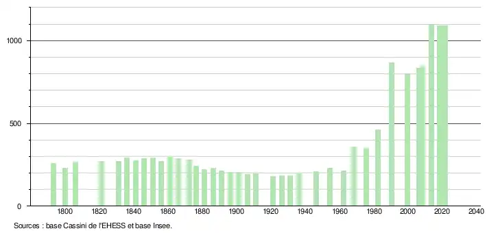L'évolution du nombre d'habitants est connue à travers les recensements de la population effectués dans la commune depuis 1793. Pour les communes de moins de 10 000 habitants, une enquête de recensement portant sur toute la population est réalisée tous les cinq ans, les populations légales des années intermédiaires étant quant à elles estimées par interpolation ou extrapolation[31]. Pour la commune, le premier recensement exhaustif entrant dans le cadre du nouveau dispositif a été réalisé en 2008[32].
