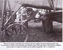 Elle fut la première femme à sauter en parachute d'un avion en 1913 [2], à 22 ans seulement, avec durant la même année l'américaine Giorgia "Tiny" Broadwick (1893-1978), en testant l'un des exemplaires fabriqués par son mari Georges Cayat, attachée par trois courroies de cuir sous la queue de son Rob, le parachute étant fixé sous une aile et relié par un autre harnais à ses aisselles, avec les mains entourées de chiffons pour ne pas être blessée par les câbles qu'elle cramponnait. Son époux, inventeur d'un système d'ouverture assistée par air comprimé, la détachait à 800 mètres d'altitude, alors que son visage était à peine à 50 centimètres de l'hélice[3].
