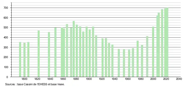 L'évolution du nombre d'habitants est connue à travers les recensements de la population effectués dans la commune depuis 1793. Pour les communes de moins de 10 000 habitants, une enquête de recensement portant sur toute la population est réalisée tous les cinq ans, les populations légales des années intermédiaires étant quant à elles estimées par interpolation ou extrapolation[16]. Pour la commune, le premier recensement exhaustif entrant dans le cadre du nouveau dispositif a été réalisé en 2008[17].