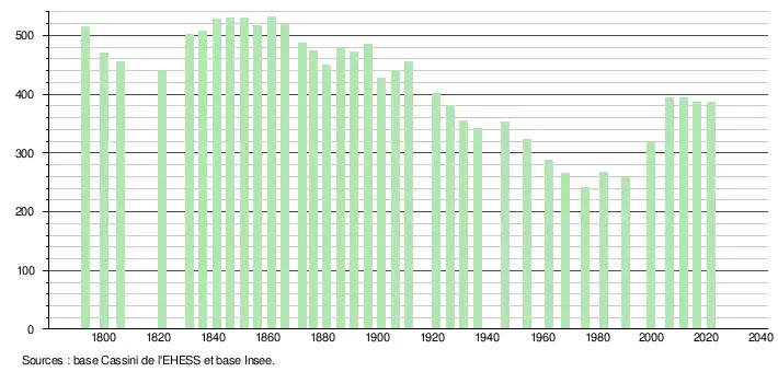 L'évolution du nombre d'habitants est connue à travers les recensements de la population effectués dans la commune depuis 1793. Pour les communes de moins de 10 000 habitants, une enquête de recensement portant sur toute la population est réalisée tous les cinq ans, les populations légales des années intermédiaires étant quant à elles estimées par interpolation ou extrapolation[22]. Pour la commune, le premier recensement exhaustif entrant dans le cadre du nouveau dispositif a été réalisé en 2006[23].
