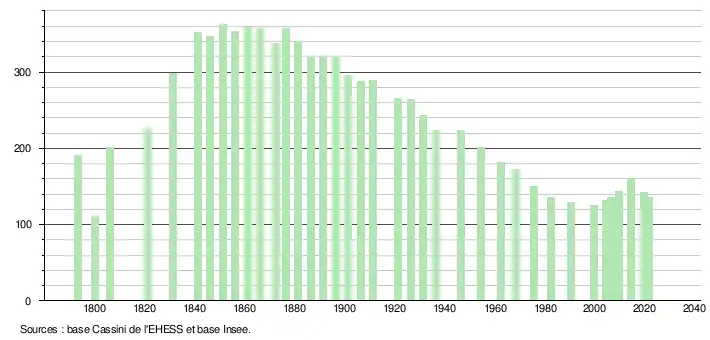 L'évolution du nombre d'habitants est connue à travers les recensements de la population effectués dans la commune depuis 1793. Pour les communes de moins de 10 000 habitants, une enquête de recensement portant sur toute la population est réalisée tous les cinq ans, les populations légales des années intermédiaires étant quant à elles estimées par interpolation ou extrapolation[24]. Pour la commune, le premier recensement exhaustif entrant dans le cadre du nouveau dispositif a été réalisé en 2004[25].