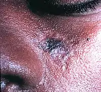 - les lésions siègent préférentiellement à la tête et sur le haut du corps ; elles sont plus fréquentes chez les femmes jeunes ;