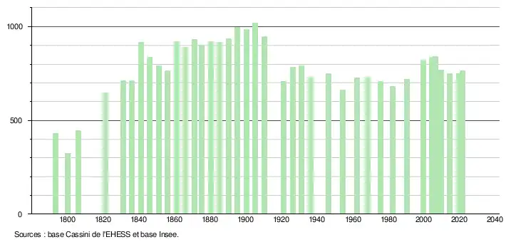 L'évolution du nombre d'habitants est connue à travers les recensements de la population effectués dans la commune depuis 1793. Pour les communes de moins de 10 000 habitants, une enquête de recensement portant sur toute la population est réalisée tous les cinq ans, les populations légales des années intermédiaires étant quant à elles estimées par interpolation ou extrapolation[29]. Pour la commune, le premier recensement exhaustif entrant dans le cadre du nouveau dispositif a été réalisé en 2004[30].
