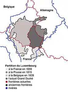 La guerre belgo-néerlandaise se termine officiellement le par la convention de Zonhoven. Lors du traité des XXIV articles signé le , Guillaume Ier obtient de conserver la partie est (germanophone au sens large) du Luxembourg ce compris la forteresse. La partie Ouest, elle, principalement romane (wallon et gaumais, à l'exception du Pays d'Arlon (Areler Land), où règne un patois luxembourgeois, devient une province du jeune État belge : la province de Luxembourg. Ce traité réduit le grand-duché de plus de la moitié de son territoire de 1815 et l'état conserve son statut compliqué : union personnelle avec les Pays-Bas, membre de la Confédération germanique, avec la présence d'une garnison prussienne dans les murs de la forteresse fédérale de Luxembourg, qui est alors la place forte la plus importante d'Europe, située à 65 km au nord de Metz, la plus importante place-forte française.