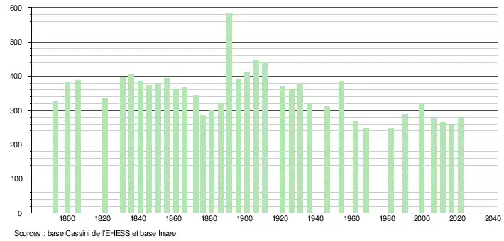 L'évolution du nombre d'habitants est connue à travers les recensements de la population effectués dans la commune depuis 1793. Pour les communes de moins de 10 000 habitants, une enquête de recensement portant sur toute la population est réalisée tous les cinq ans, les populations légales des années intermédiaires étant quant à elles estimées par interpolation ou extrapolation[16]. Pour la commune, le premier recensement exhaustif entrant dans le cadre du nouveau dispositif a été réalisé en 2006[17].