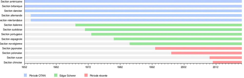 L'établissement propose 14 sections internationales : américaine[8], allemande[9], britannique[10], chinoise (mandarin)[11], danoise[12], espagnole[13], italienne[14], japonaise[15], néerlandaise[16], norvégienne[17], polonaise[18], portugaise[19], russe[20] et suédoise[21].