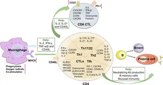 Les cellules T CD4+ sont indirectement impliquées dans le contrôle des agents pathogènes en régulant les fonctions d'autres cellules immunitaires, telles que l'activation des populations immunitaires innées, l'assistance à la réponse des lymphocytes T CD8+ , la maturation des cellules B et la production d'anticorps. Les lymphocytes T CD4+, principalement la population Th1, jouent un rôle central dans l'activation des macrophages pro-inflammatoires par polarisation cellulaire en libérant les cytokines interleukine 2, interféron gamma et facteur de nécrose tumorale et en exprimant CD40L[53]. Les macrophages activés augmentent leur efficacité antimicrobienne en augmentant la phagocytose microbienne, production d'oxyde nitrique et de radicaux oxygène, expression de molécules du CMH de classe II et d'un certain nombre de molécules co-stimulatrices pour une présentation efficace de l'antigène aux lymphocyte T CD8+ T[56]. Les macrophages activés sont également importants pour éliminer efficacement les agents pathogènes intracellulaires tels que les mycobactéries qui se développent principalement à l'intérieur des macrophages et sont protégés des lymphocytes cytotoxiques et des anticorps neutralisants[57].