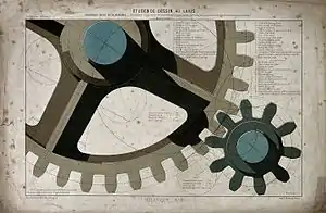 En horlogerie, la denture des roues peut être de différents types ; sur les engrenages des horloges d'édifices, le profil est passé d'une forme triangulaire à d'autres plus élaborées, déterminées par tâtonnement puis, aux XVIIe et XVIIIe siècles, à des profils plus scientifiques : le profil épicycloïdal et le profil en développante de cercle permettant une transmission par roulement, donc sans glissement et théoriquement sans frottement[14].