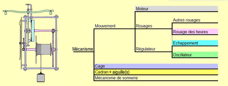 - le mouvement : dispositif qui regroupe l'ensemble des mécanismes élémentaires assurant le mouvement régulier de sortie pour donner l'heure voulue[N 3], soit :