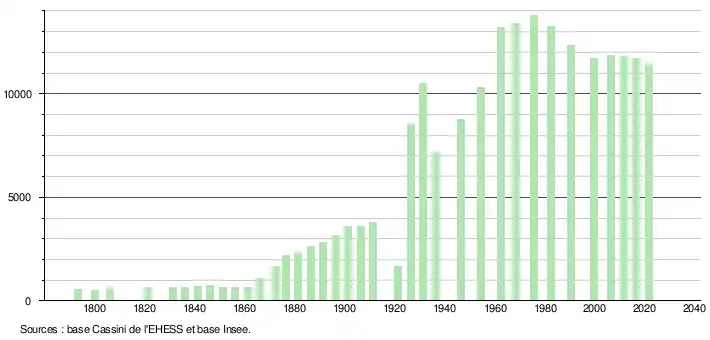 L'évolution du nombre d'habitants est connue à travers les recensements de la population effectués dans la commune depuis 1793. Pour les communes de plus de 10 000 habitants les recensements ont lieu chaque année à la suite d'une enquête par sondage auprès d'un échantillon d'adresses représentant 8 % de leurs logements, contrairement aux autres communes qui ont un recensement réel tous les cinq ans[38],[Note 3].
