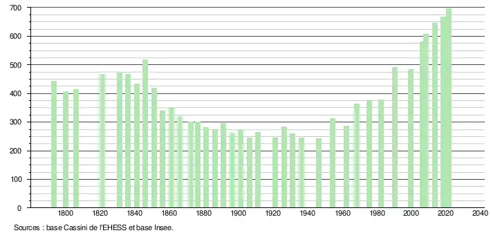 L'évolution du nombre d'habitants est connue à travers les recensements de la population effectués dans la commune depuis 1793. Pour les communes de moins de 10 000 habitants, une enquête de recensement portant sur toute la population est réalisée tous les cinq ans, les populations légales des années intermédiaires étant quant à elles estimées par interpolation ou extrapolation[51]. Pour la commune, le premier recensement exhaustif entrant dans le cadre du nouveau dispositif a été réalisé en 2008[52].