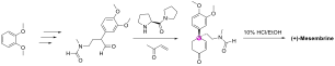 En 1971, Shun-ichi Yamada a rapporté la première synthèse totale asymétrique de la (+)-mésembrine. Le carbone quaternaire est introduit par une annélation de Robinson asymétrique promu par un dérivé L-proline[12].