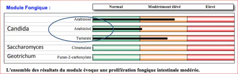 Le dosage des métabolites organiques urinaires permet de déterminer une dysbiose intestinale colique par les marqueurs bactériens, ou une candidose chronique par les marqueurs fongiques.