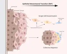 La transition épithélio-mésenchymateuse est le processus d'acquisition des cellules épithéliales qui développent la capacité d'envahir, de résister et de se disséminer[10]. Les cellules épithéliales sont étroitement liées les unes aux autres et à la matrice extracellulaire[11]. La transition épithélio-mésenchymateuse régit les altérations biochimiques réversibles qui permettent à une cellule épithéliale d'atteindre un phénotype mésenchymateux et confère une plasticité épithéliale-mésenchymateuse à la cellule épithéliale[12], ce qui est crucial pour la progression du cancer et des métastases. Cependant, toutes les cellules provenant du site tumoral primaire ne contribuent pas au développement de métastases.