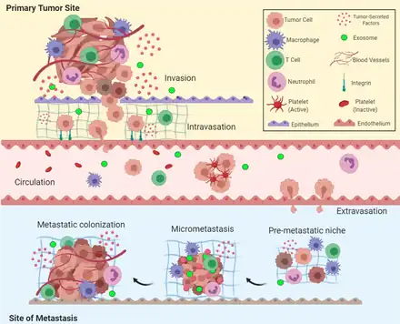 Les sites secondaires ne reçoivent pas passivement les cellules cancéreuses. En fait, le microenvironnement tumoral sélectionne une zone appelée niche prémétastatique avant même l'initiation des métastases[25]. Le développement d'un niche pré-métastatique est un processus en plusieurs étapes impliquant des facteurs de sécrétion et des vésicules extracellulaires induisant un remodelage de la matrice extracellulaire et une immunosuppression locale[25]. Les microscopes à haute définition ont obtenu des images de cellules cancéreuses partageant du matériel biologique avec des cellules moins cancéreuses rendant ces cellules plus cancéreuses[26]. Les cellules cancéreuses libèrent des vésicules qui transportent l'ARN messager transcrit à partir de gènes impliqués dans la migration cellulaire et métastases, qui sont ensuite acceptées par d'autres cellules[26],[27]. Une fois que les cellules saines ont englouti ces vésicules, les cellules qui n'expriment pas de phénotype malin commencent à migrer plus rapidement. Les gènes transférés améliorent également la capacité des cellules à envahir d’autres organes[26]. Ainsi, les caractéristiques métastatiques peuvent être transférées par échange de vésicules extracellulaires[26].